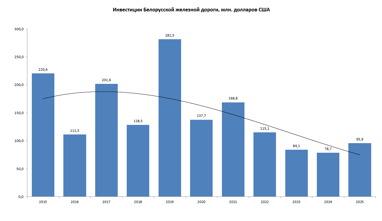 Начиная с 2020 года инвестирование на БЖД падает, а с 2023 года — весьма значительно. В период с 2020 по 2025 год — с 282 до 96 млн.$ — почти в три раза! Первый провал был в 2020 году — более чем на половину.