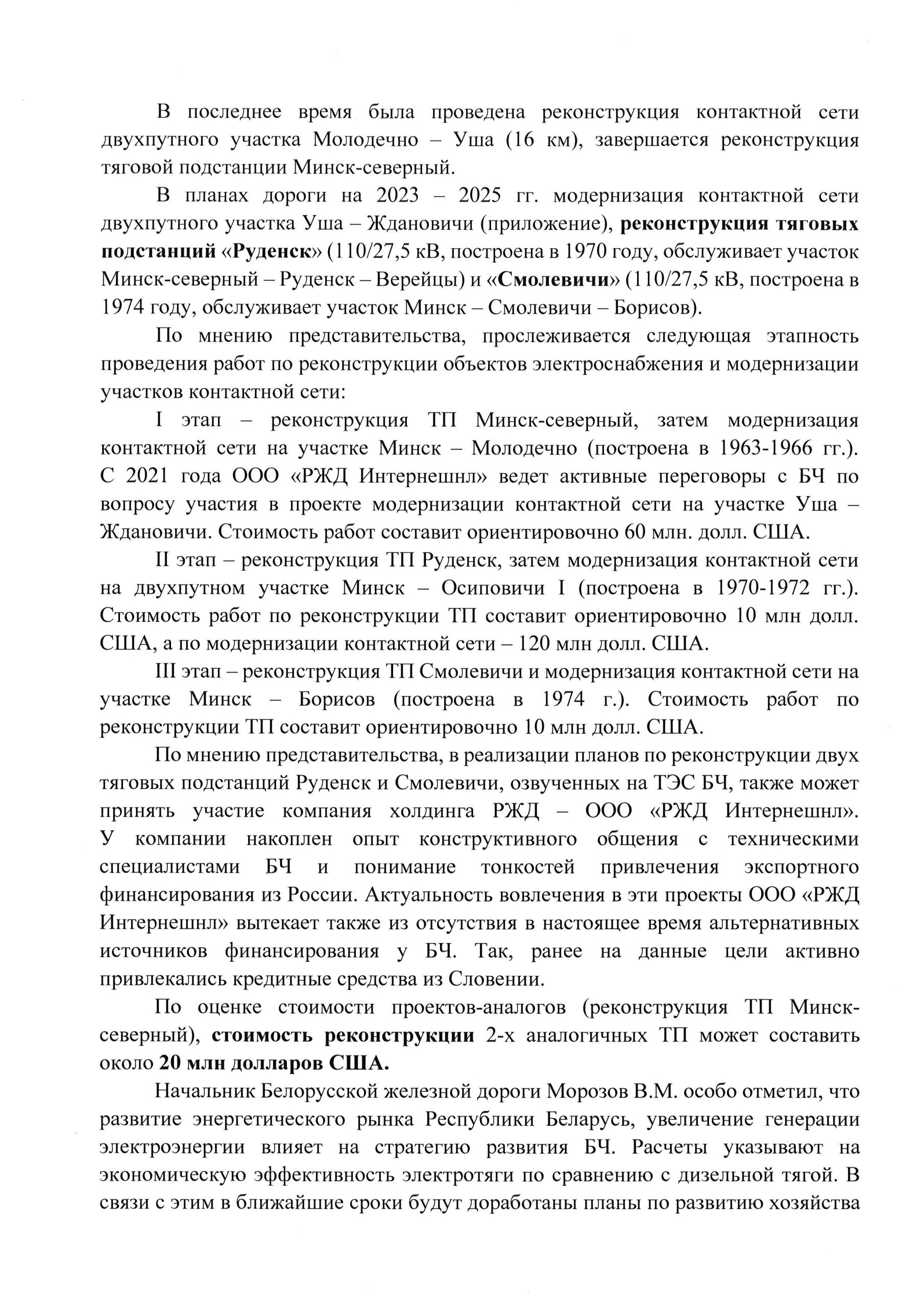 В приведённых документах представительство ОАО «РЖД» в Беларуси предлагает фактически навязать БЧ участие компании холдинга РЖД — ООО «РЖД Интернешнл» в реализации планов по модернизации инфраструктуры.